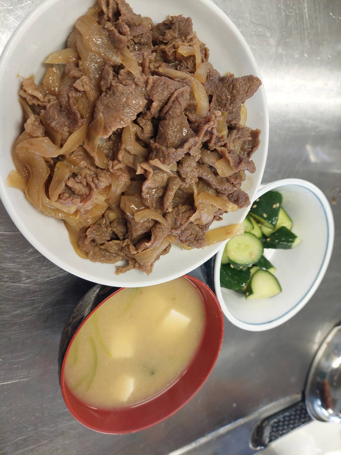 本日の献立は牛丼、なめこと豆腐の味噌汁、やみつききゅうりでした。