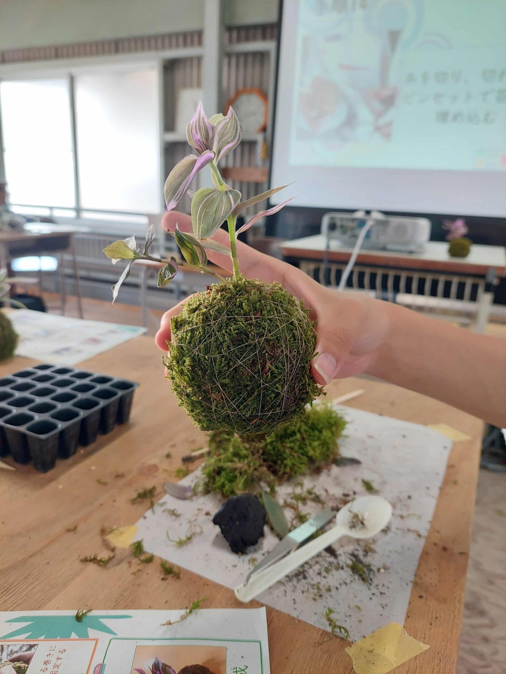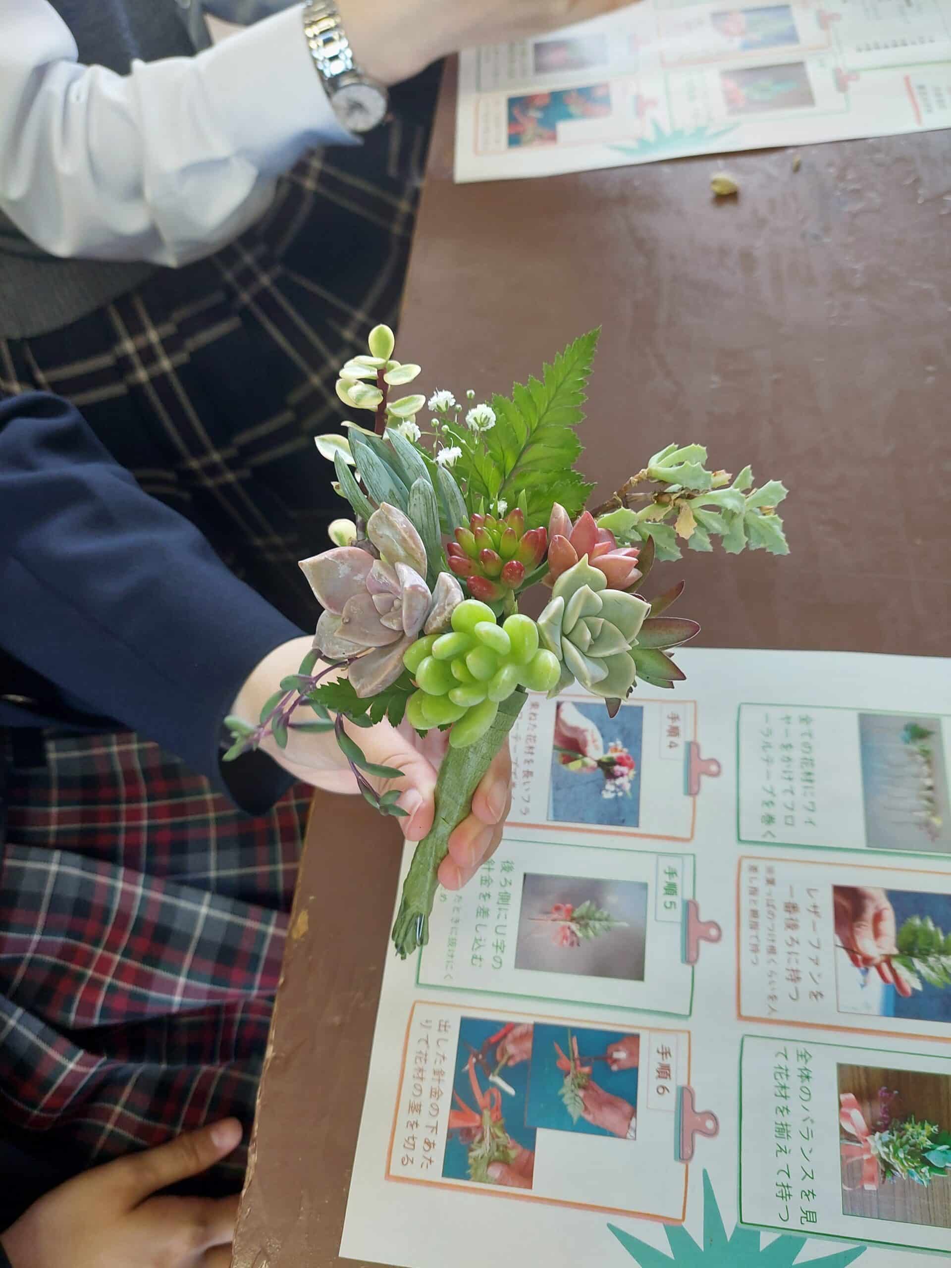 研修会で、多肉植物を使ったコサージュ作りとこけ玉作りの2種類の研修が行われ、生徒は熱心に活動していました。