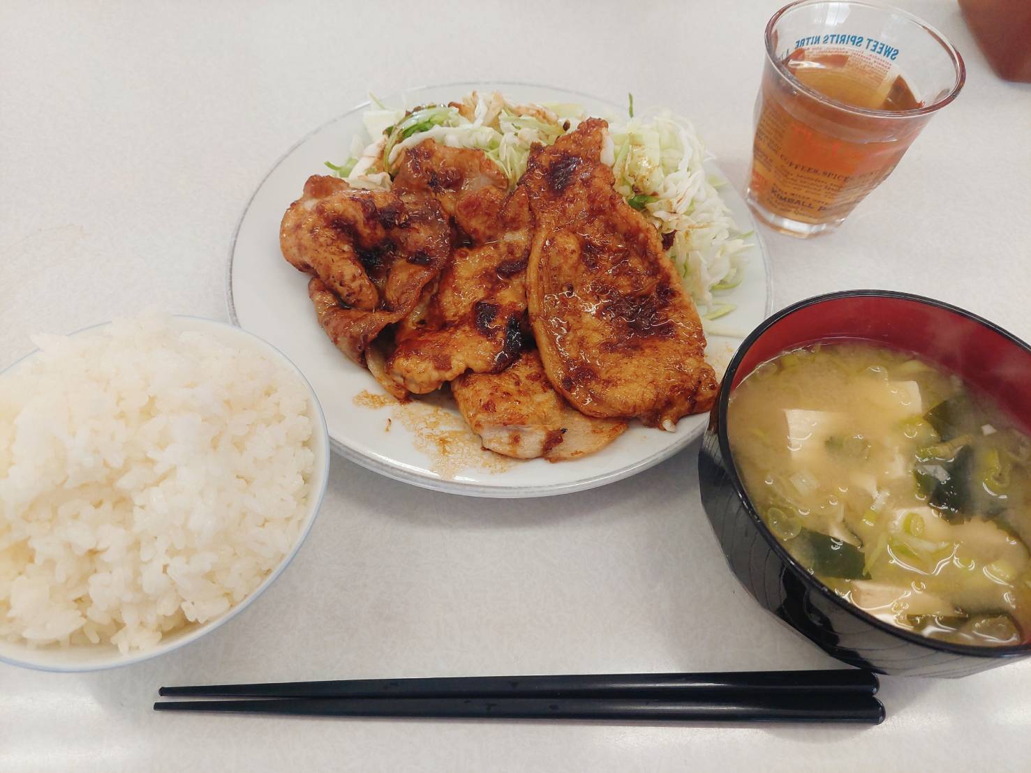 本日の献立は白ご飯、豚肉の生姜焼き、豆腐とわかめの味噌汁でした。