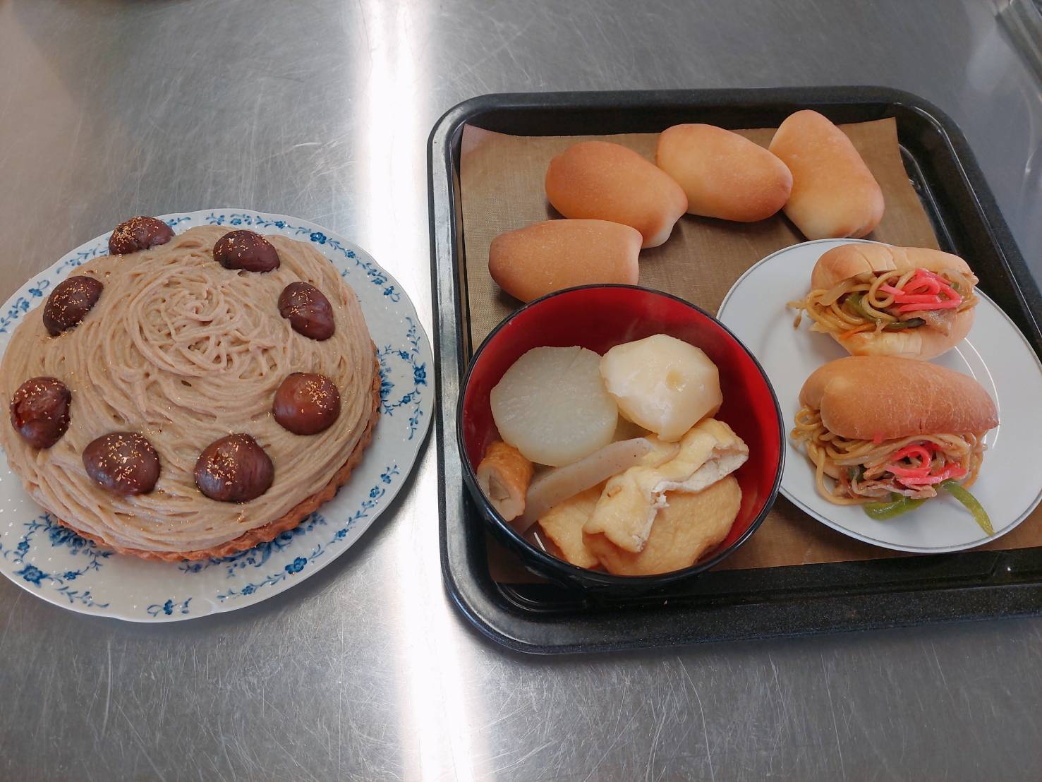 本日の献立は焼きそばパン、おでん、モンブランタルトでした。