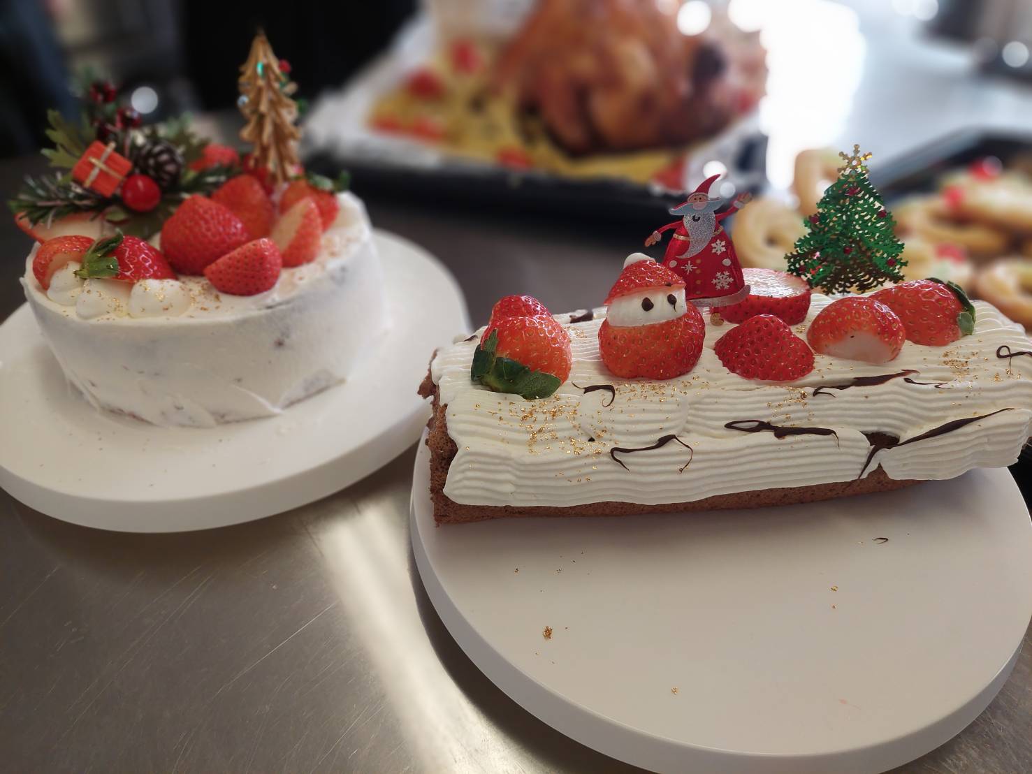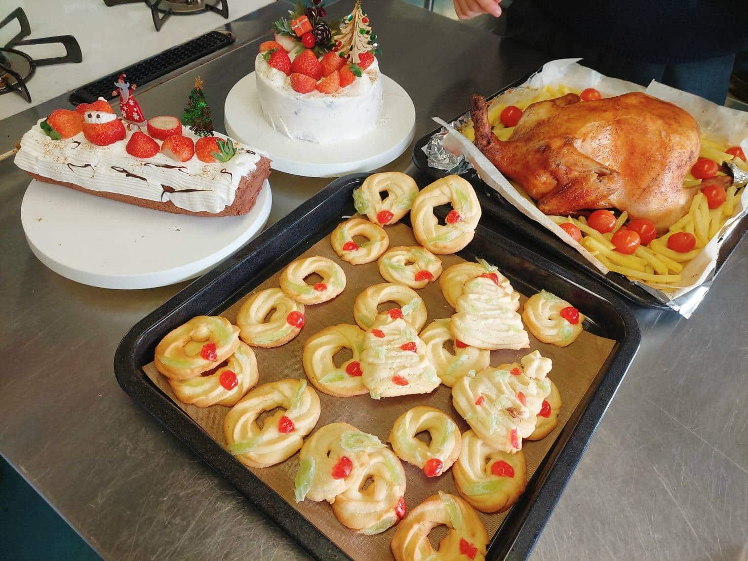 ローストチキン、ホールケーキ、ブッシュドノエル、リース型クッキーと、今年を締めくくる豪華な料理たちに生徒は感動していました。