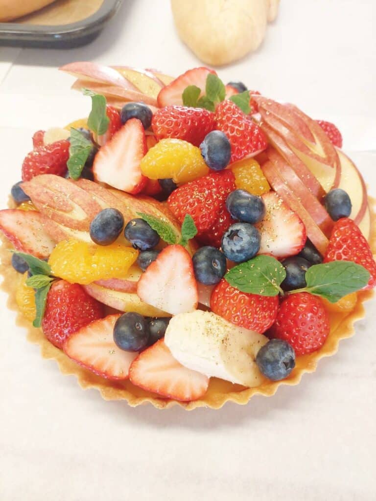 また、この日が誕生日だという生徒の要望でフルーツタルトを作りました。金粉もまぶされ、豪華なケーキとなりました。
