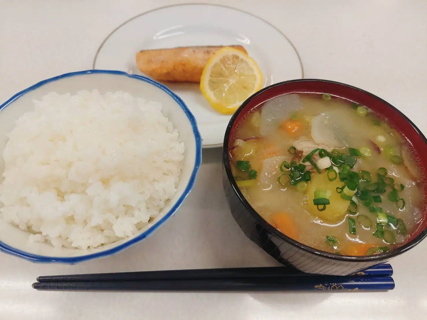 今日の献立はご飯、鮭のムニエル、豚汁でした。