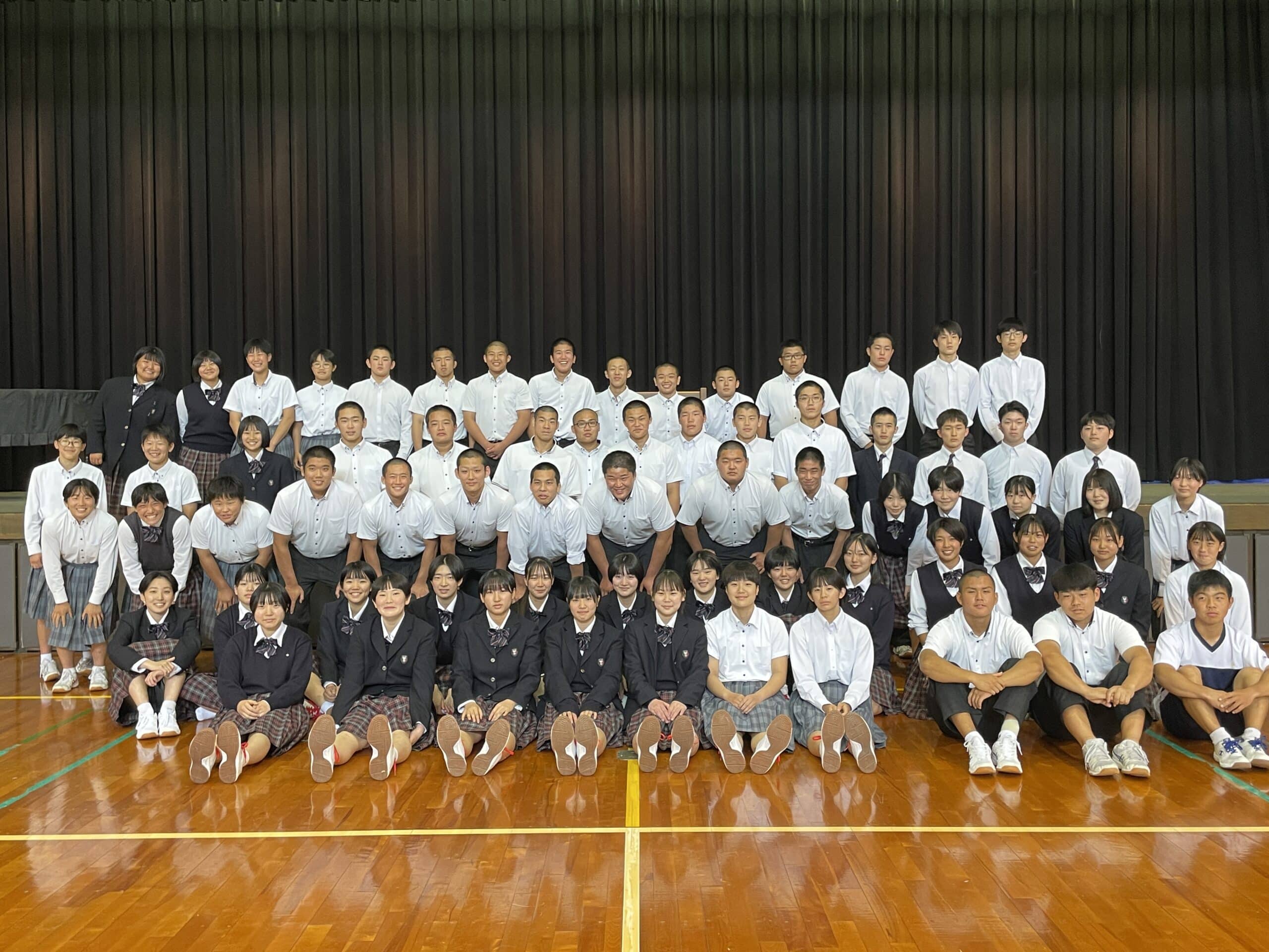 選手たちは校長先生と生徒会長の越智美月さんから、激励のことばでエールをもらい、全校生から拍手でエールをもらいました。