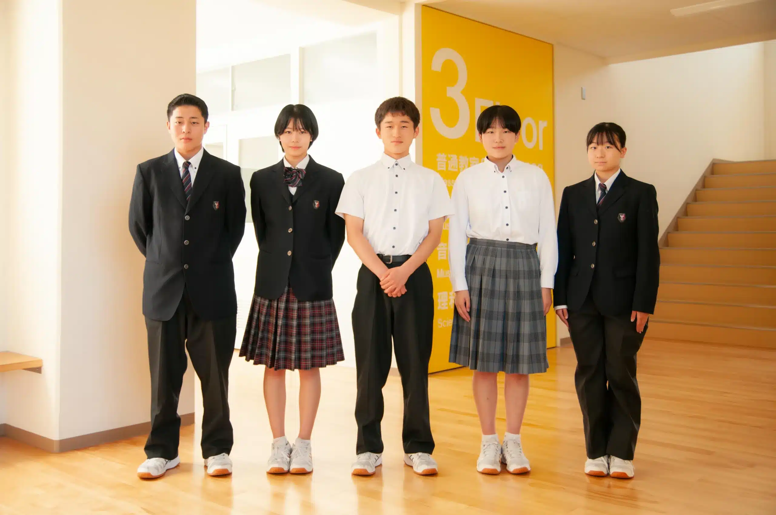 ネイビーの3ボタン・シングルブレザー。左胸にあるエンブレムは、明徳の校歌の歌詞にある「不死鳥」がモチーフ。